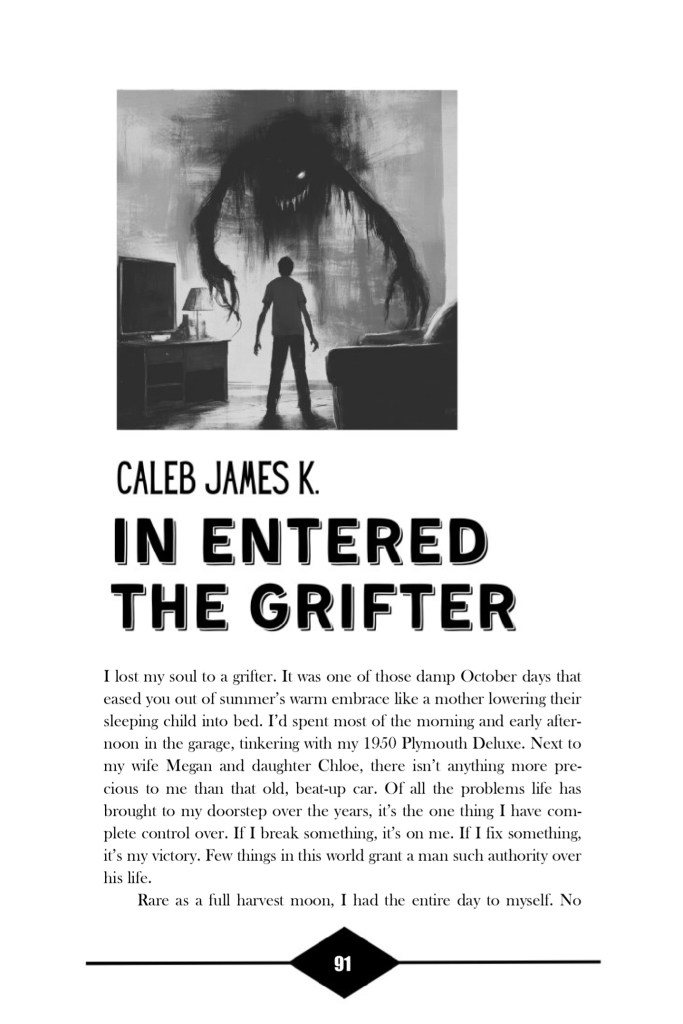 For those unfamiliar with the story, I wrote In Entered The Grifter many years ago as an homage to Stephen King’s incredible short story The Man in the Black Suit. While I ultimately didn’t do anything close to his story, I did create what I think turned out to be a superbly unsettling character in The Grifter, a “door-to-door- book salesman” who is out to make a different kind of deal.